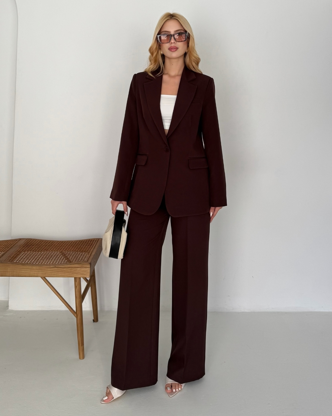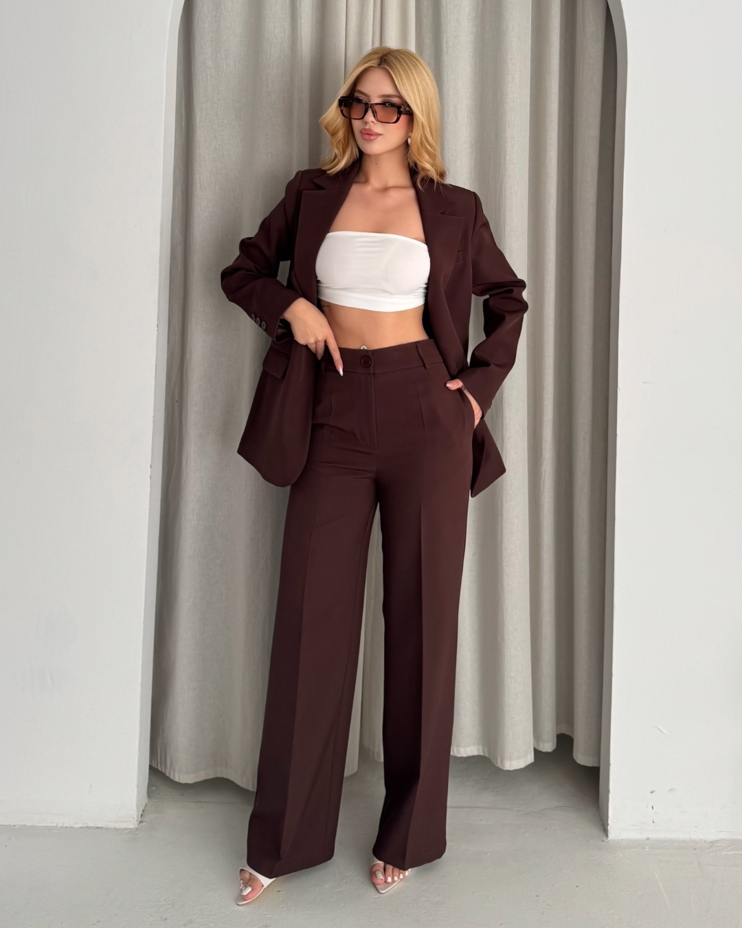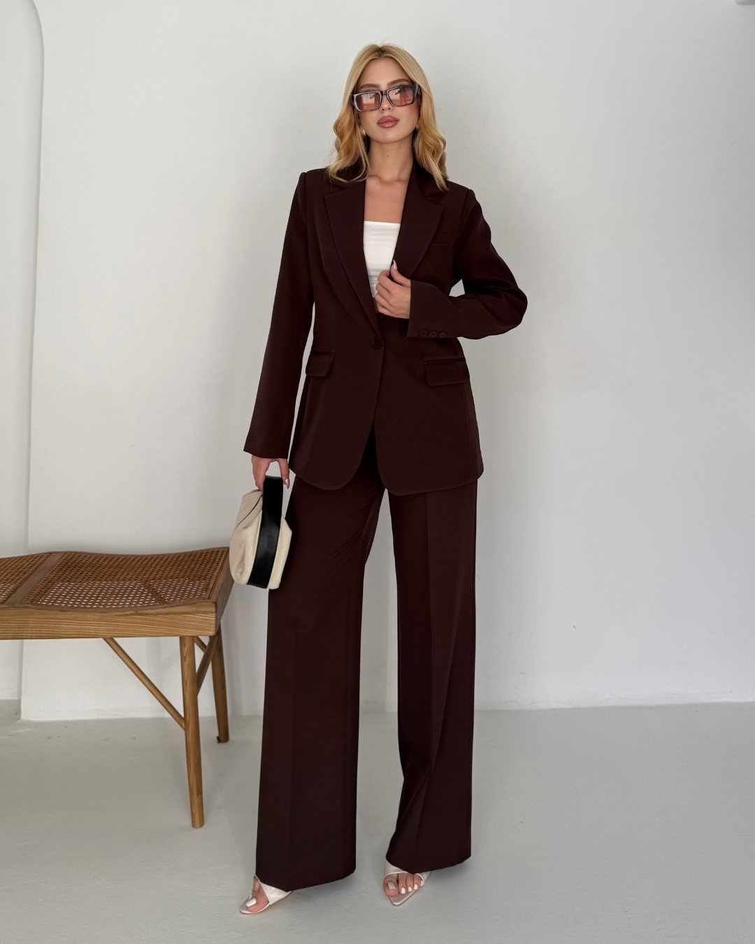 Kadın Acı Kahve Blazer Ceket Pantolon Takım, modern şıklığı ve zamansız zarafeti bir araya getiren özel bir tasarımdır.; Şık ve modern kesim ile dikkat çeken bu takım, her ortamda stilinizi güçlendirir.; Takım; oversize blazer ceket ve yüksek bel palazzo pantolon dan oluşur, böylece hem rahat hem de göz alıcı bir görünüm sunar.; Akışkan yapısı sayesinde vücuda kusursuz oturan rahat ve akışkan kumaş gün boyu konfor sağlar.; Ofis, davet ve günlük şık kombinler için ideal olan bu takım, ister topuklu ayakkabılarla ister zarif düz ayakkabılarla kolayca kombinlenebilir.; Minimal detayları ve kusursuz duruşu ile dolabınızın vazgeçilmez parçalarından biri olacak.; Zarif, güçlü ve modern bir duruş için bu takımı tercih edin.; İş toplantılarından özel davetlere kadar her ortamda sofistike bir stil yaratın.