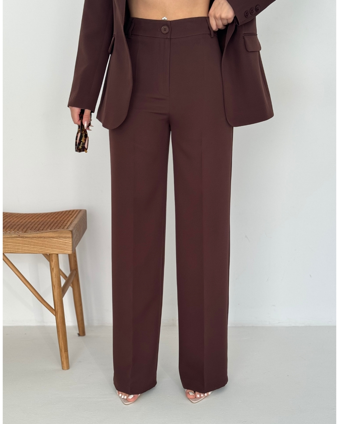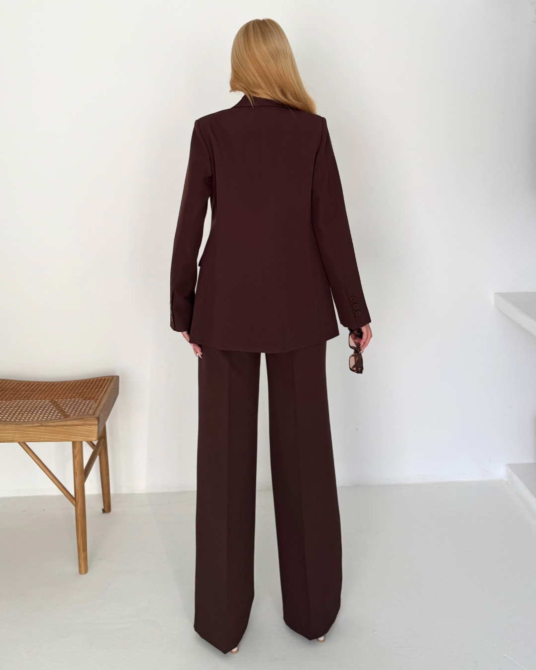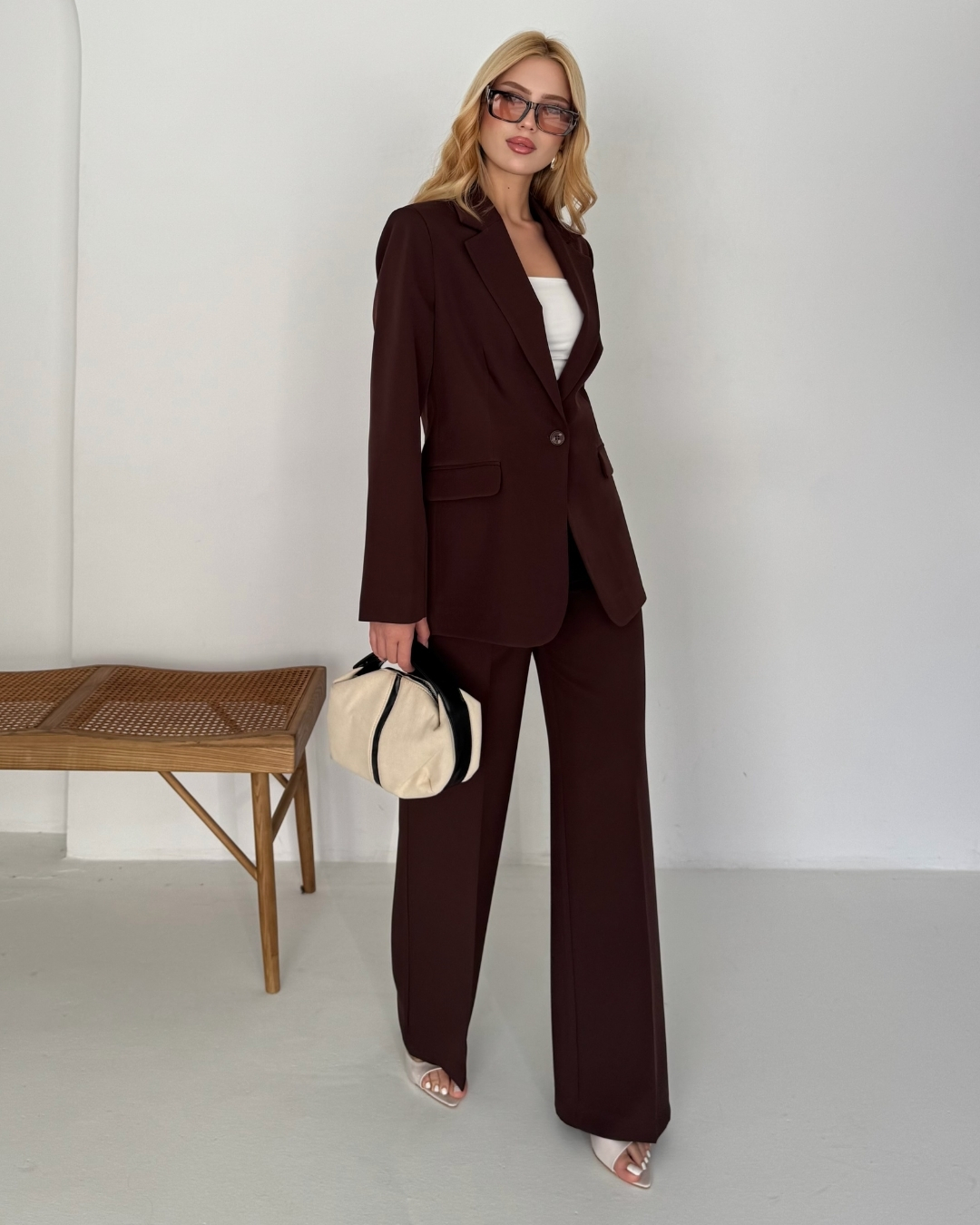 Kadın Acı Kahve Blazer Ceket Pantolon Takım, modern şıklığı ve zamansız zarafeti bir araya getiren özel bir tasarımdır.; Şık ve modern kesim ile dikkat çeken bu takım, her ortamda stilinizi güçlendirir.; Takım; oversize blazer ceket ve yüksek bel palazzo pantolon dan oluşur, böylece hem rahat hem de göz alıcı bir görünüm sunar.; Akışkan yapısı sayesinde vücuda kusursuz oturan rahat ve akışkan kumaş gün boyu konfor sağlar.; Ofis, davet ve günlük şık kombinler için ideal olan bu takım, ister topuklu ayakkabılarla ister zarif düz ayakkabılarla kolayca kombinlenebilir.; Minimal detayları ve kusursuz duruşu ile dolabınızın vazgeçilmez parçalarından biri olacak.; Zarif, güçlü ve modern bir duruş için bu takımı tercih edin.; İş toplantılarından özel davetlere kadar her ortamda sofistike bir stil yaratın.