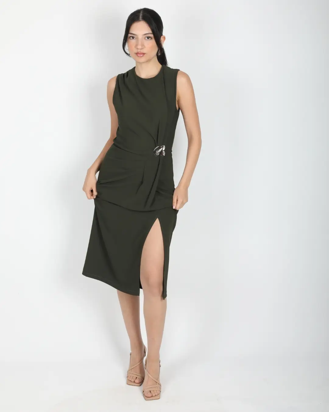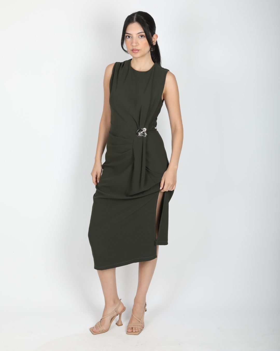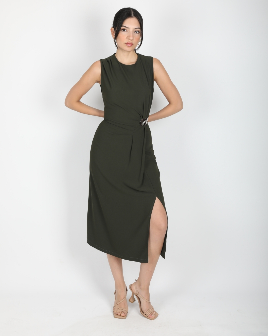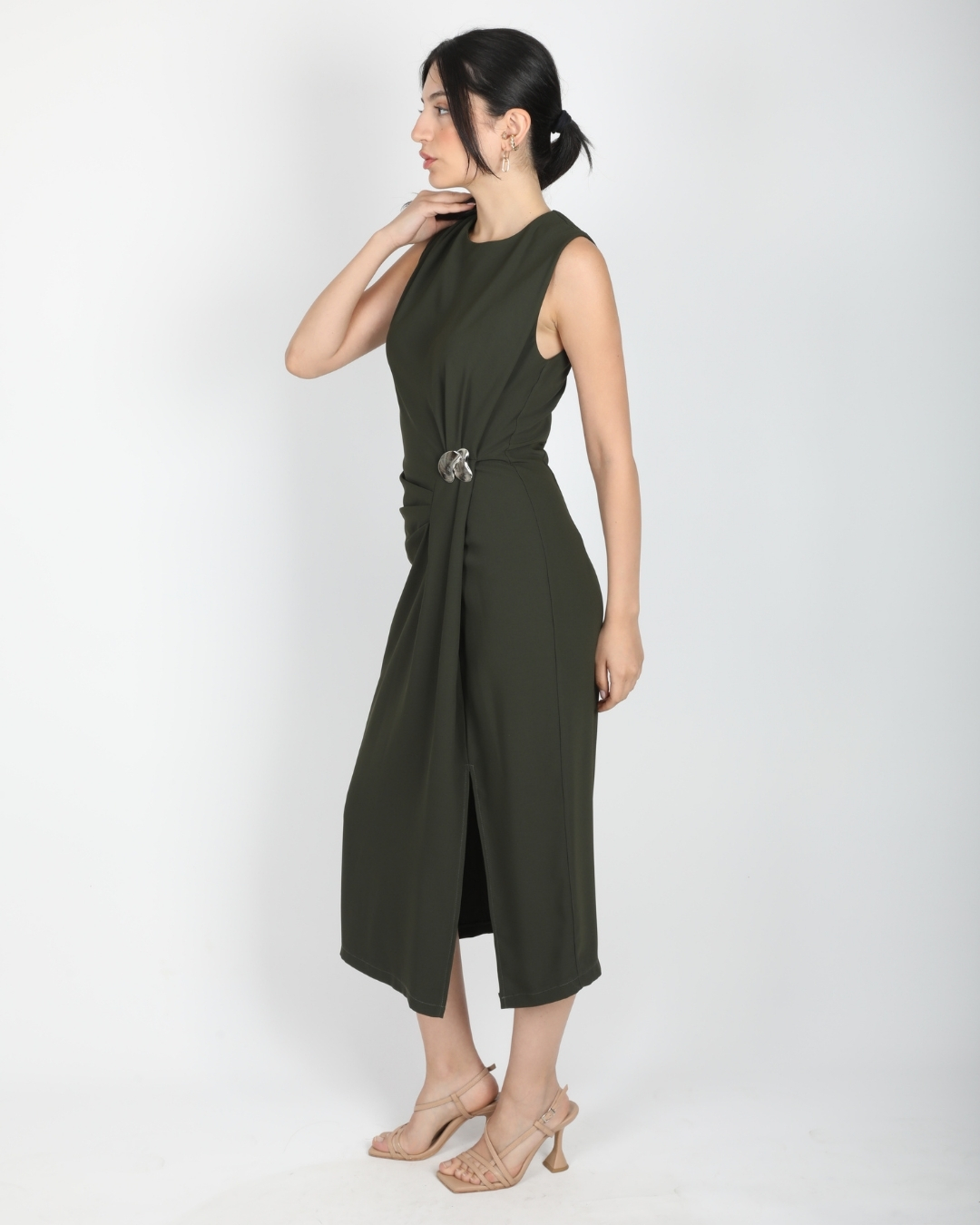 Ana Sayfa Elbise Haki Kolsuz Bel Drapeli Aksesuarlı Yırtmaçlı Midi Boy Elbise