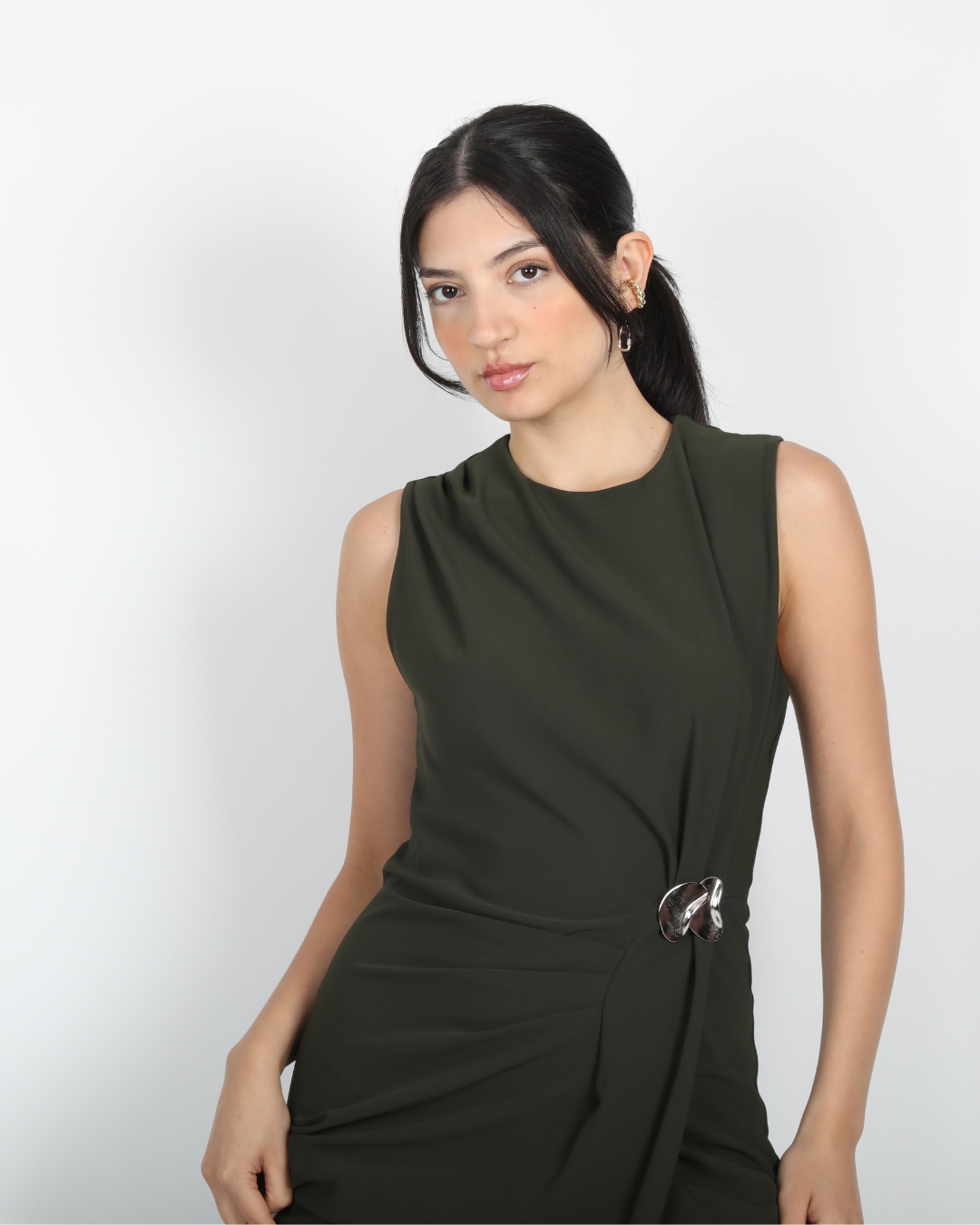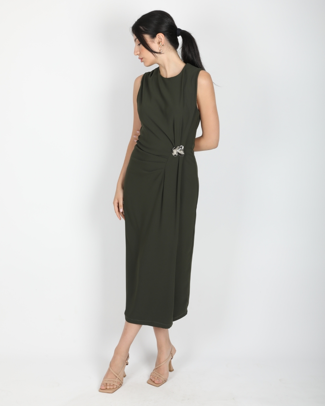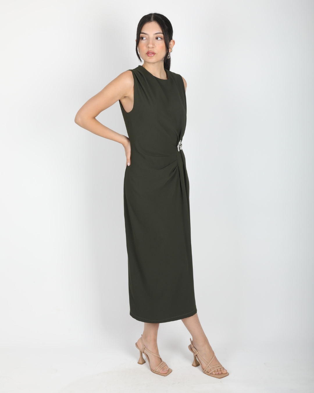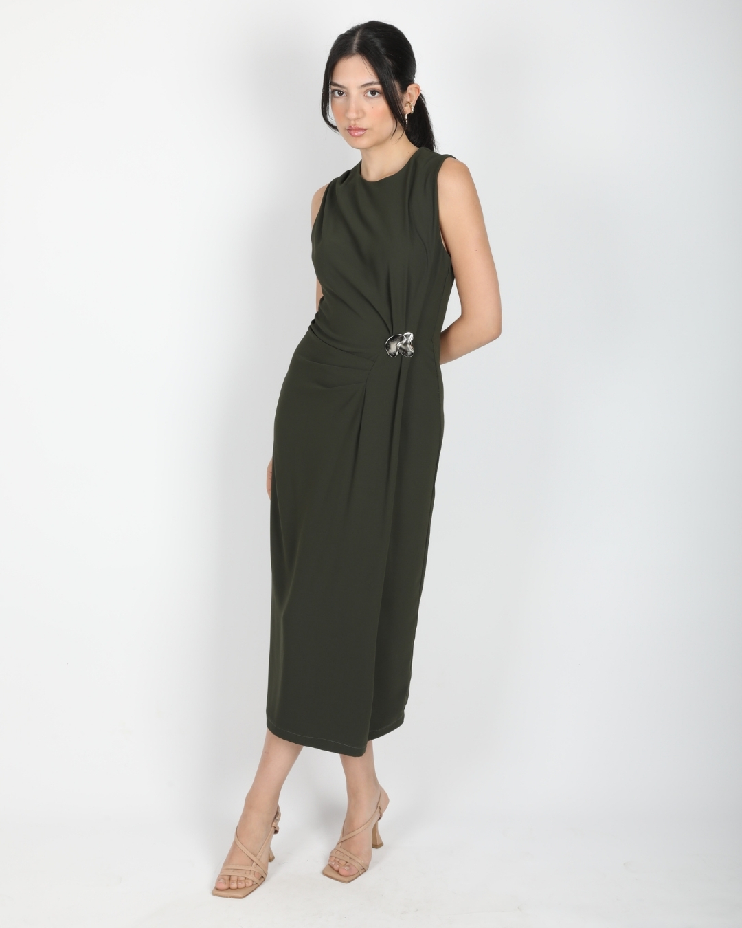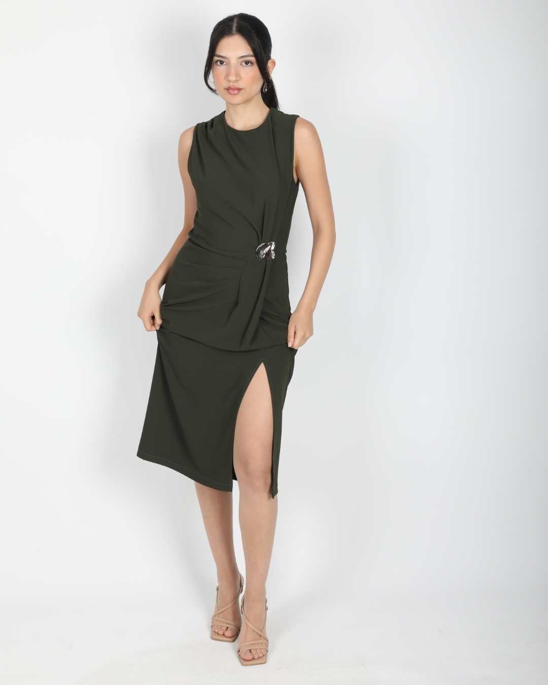 Ana Sayfa Elbise Haki Kolsuz Bel Drapeli Aksesuarlı Yırtmaçlı Midi Boy Elbise