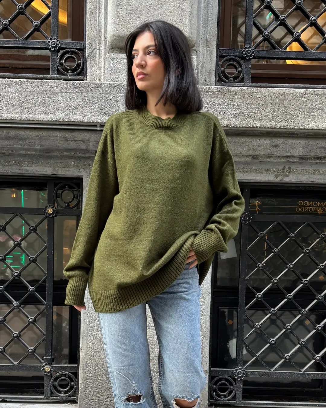 Haki Yeşili Bisiklet Yaka Oversize Salaş Triko kazak