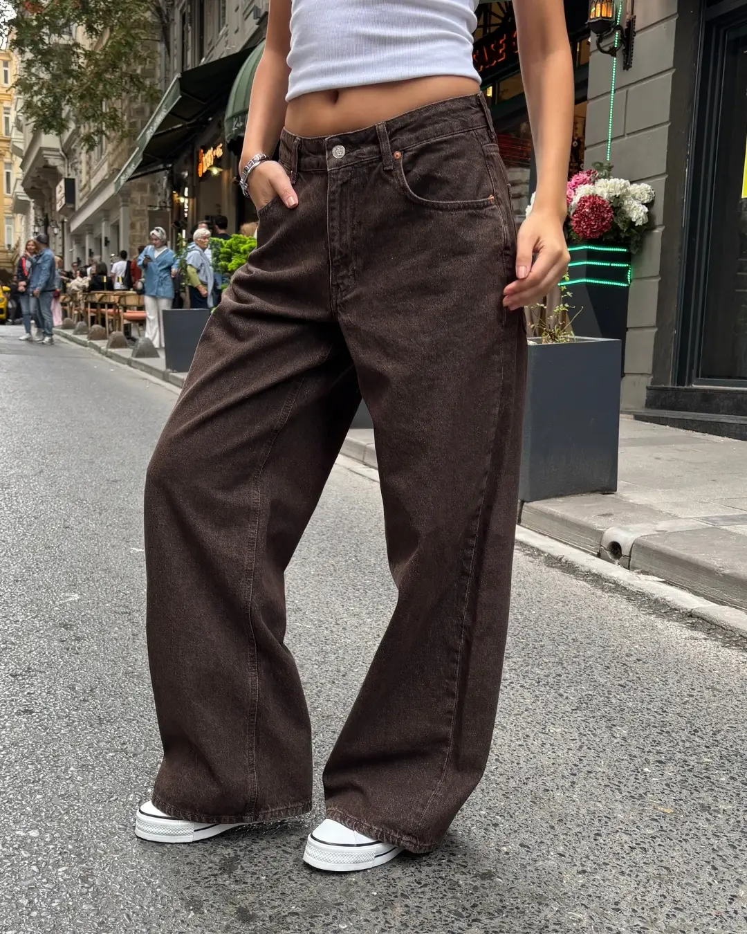 “Kadın kahverengi baggy pantolon, düşük bel tasarımı ve geniş paça formuyla modern ve salaş bir stil sunar.; Rahat bol kesimi sayesinde günlük kullanımda maksimum konfor sağlarken, sokak modasının öne çıkan parçaları arasında yer alır.; Denim kumaşı dayanıklı ve uzun ömürlüdür.; Spor ayakkabılar, crop top ve basic tişörtlerle kolayca kombinlenebilir.; – Tüm sezonlarda rahatlıkla tercih edilebilen, sportif ve şık bir görünüm sunan kadın baggy jean pantolon.; – Beş cep detayı ile pratik kullanım sağlar ve günlük eşyalarınız için yeterli alan sunar.; – Yıkamalı dokusuyla modern ve trend bir görünüm kazandırırken, denim materyali dayanıklılığı arttırır.; – Kemersiz tasarımı sayesinde kolayca kombinlenebilir ve kişisel stilinize uyum sağlar.; – Bol paça kesimi ile rahat hareket etme özgürlüğü sunarken, düz deseniyle sade ve zamansız bir tarz yaratır.; – Recycle sürdürülebilirlik detayına sahip olmasıyla çevre dostu bir tercih olur.; – Düşük bel tasarımı modern silueti vurgular ve Cool & Comfort persona’yı ön plana çıkartır.; – Baggy kalıbı ile rahatlığı ön planda tutarken, TR menşeli olmasıyla yerel üretim desteklenmiş olur.; – Yetişkin yaş grubuna hitap eden bu pantolon, her tür ortamda konforlu ve stil sahibi görünmenizi sağlar.;