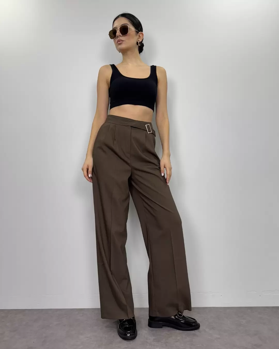 Kahve Rengi Tokalı Pileli Palazzo Pantolon