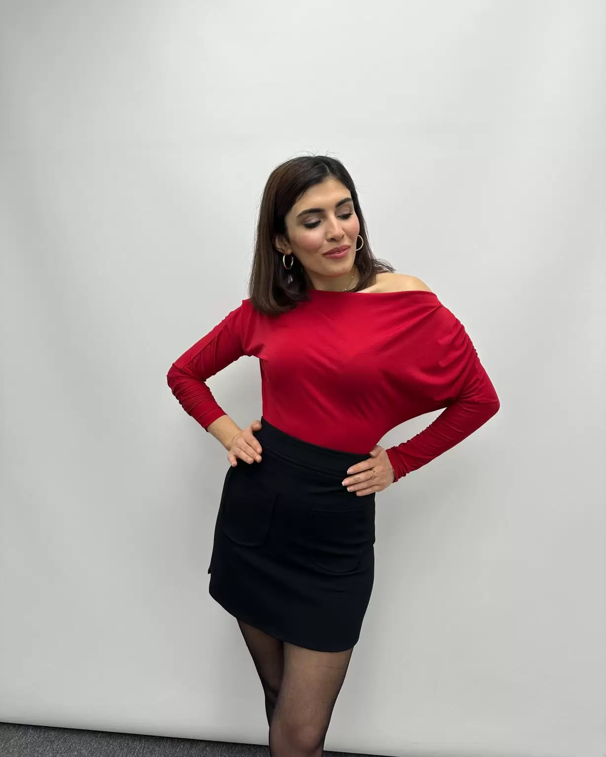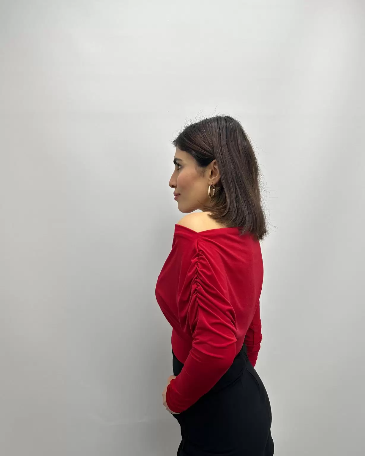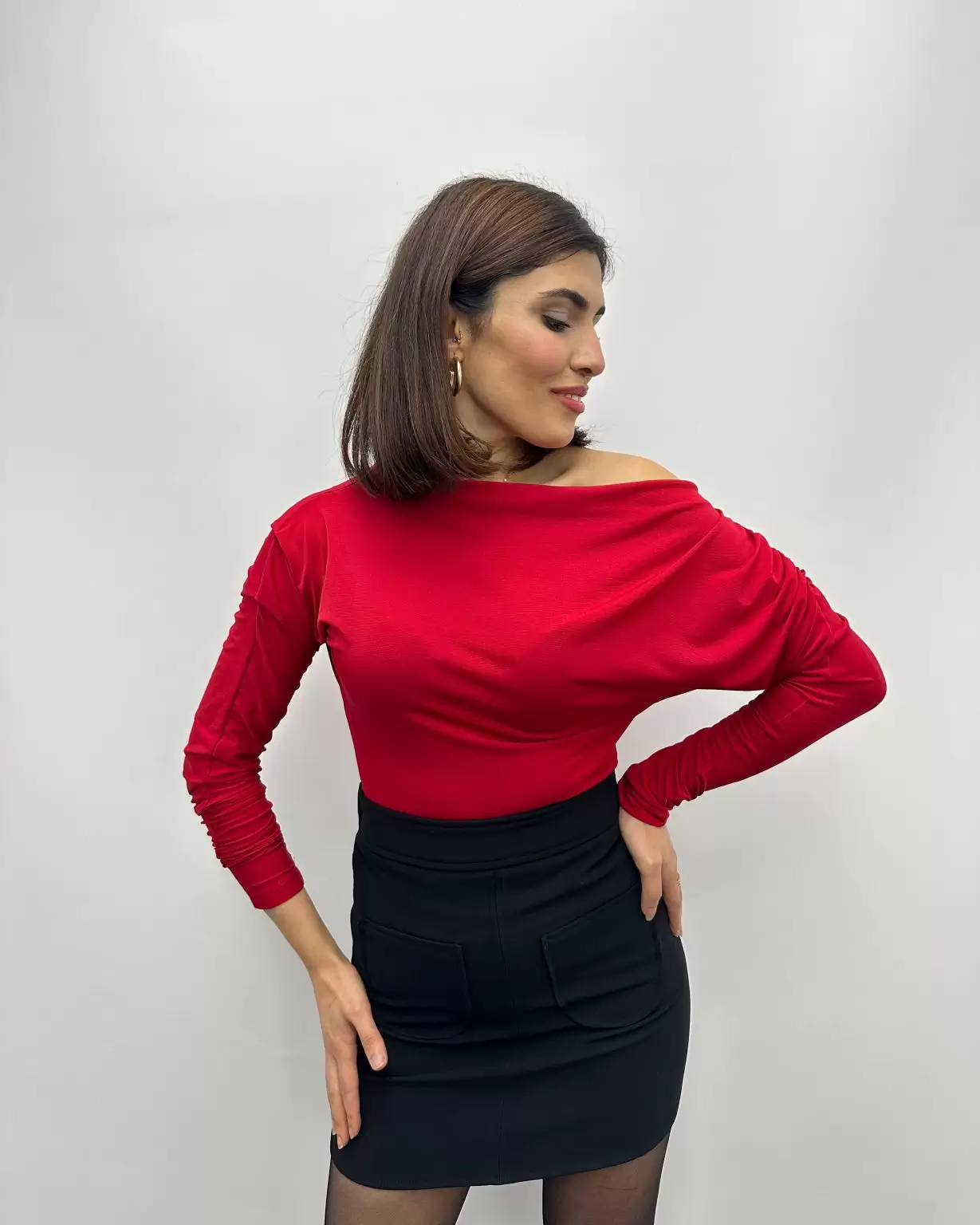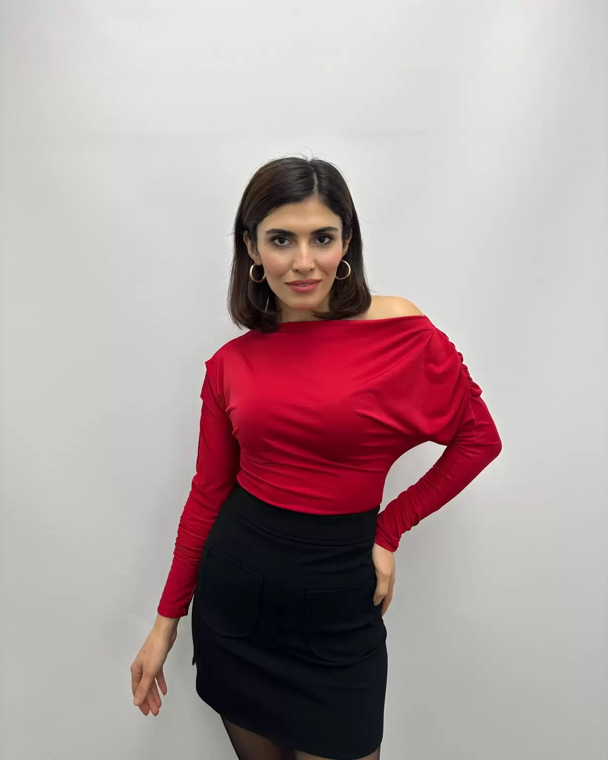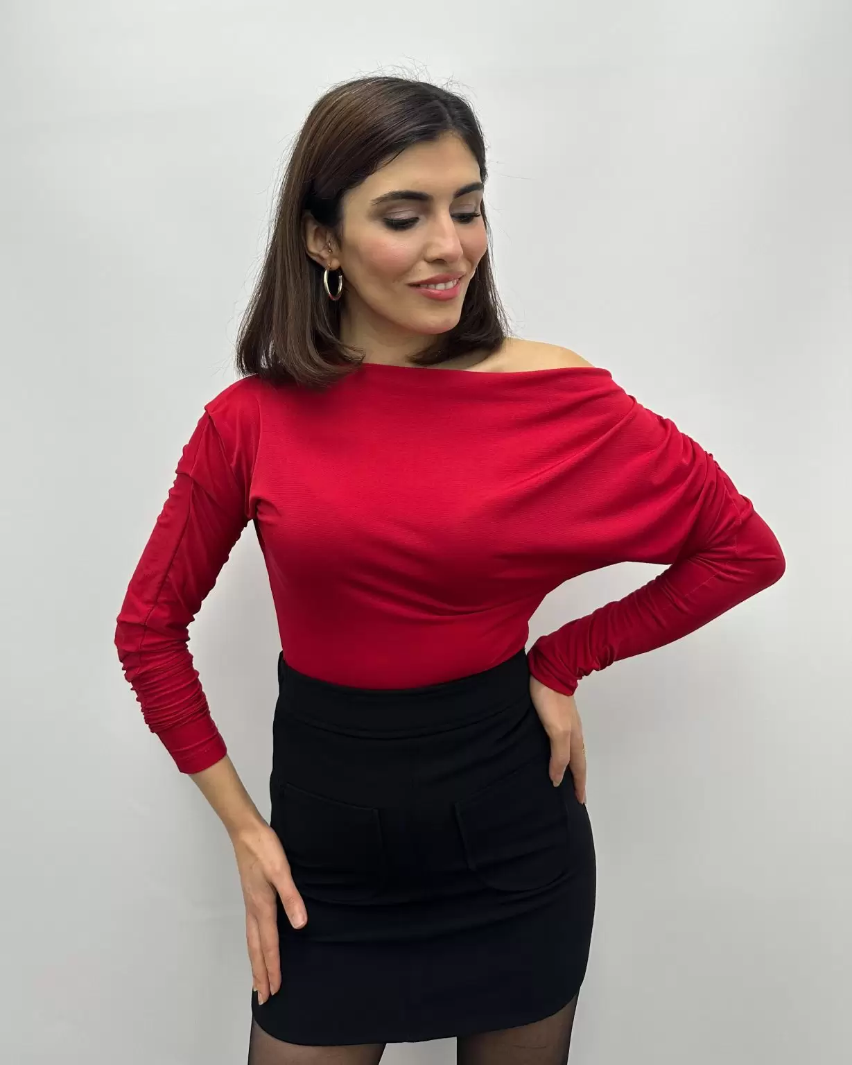 Kırmızı Düşük Omuzlu Yarasa Kol Bluz