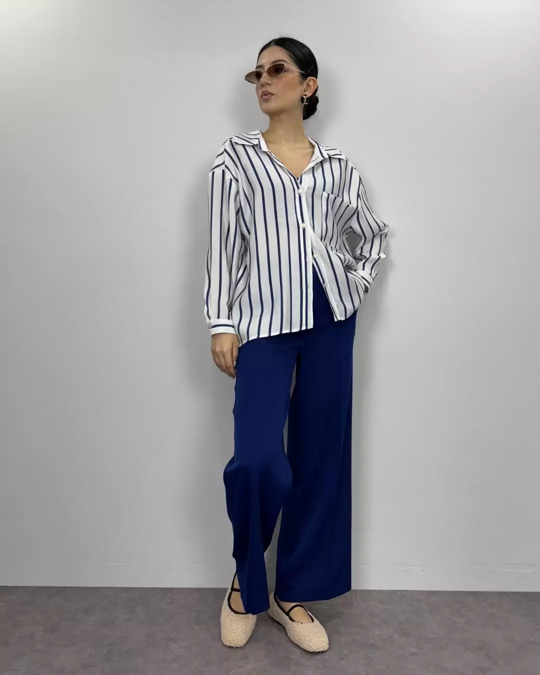 Lacivert Çizgili Modal Kumaş Oversize Gömlek
