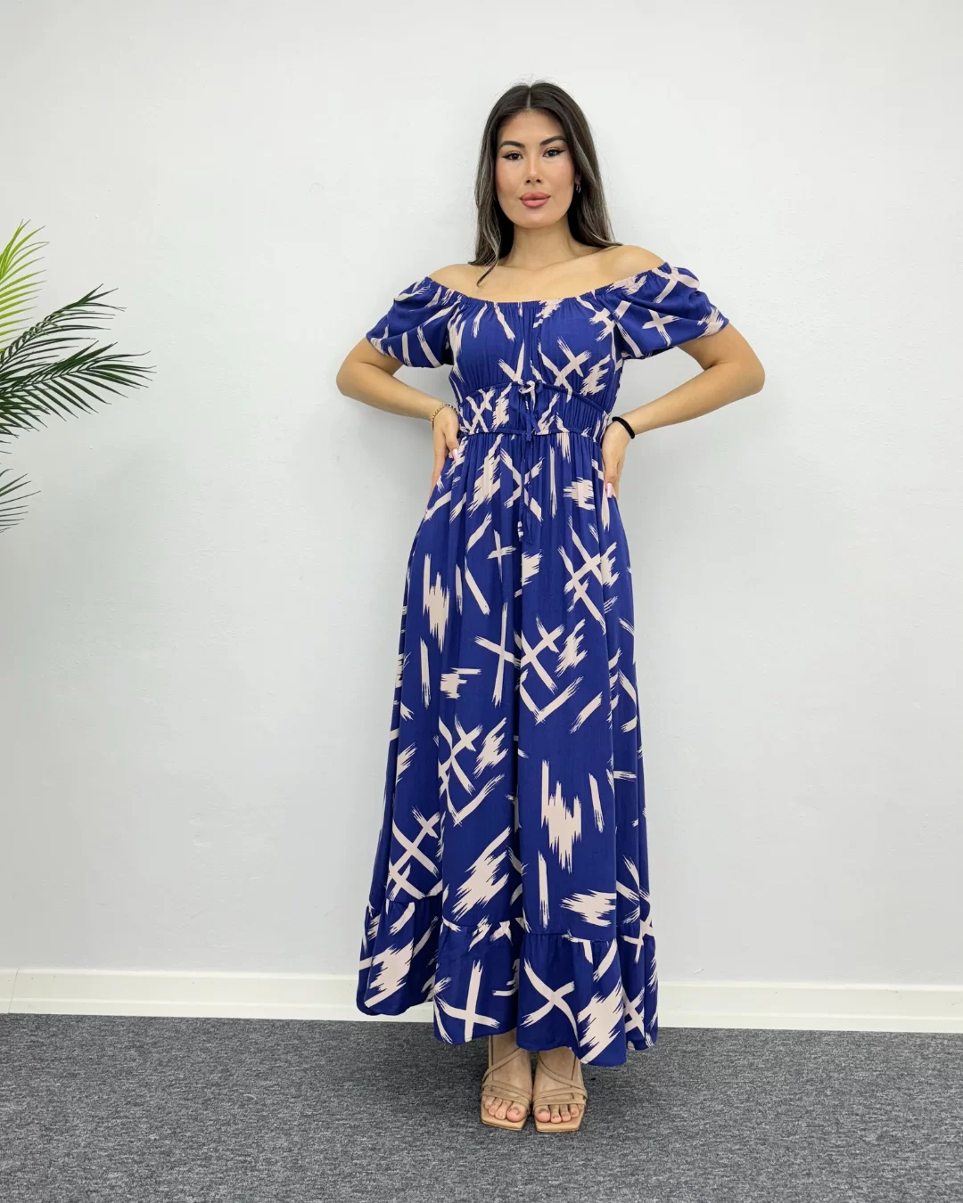 Ana Sayfa Elbise Mavi Çarpım Desenli Viskon Elbise