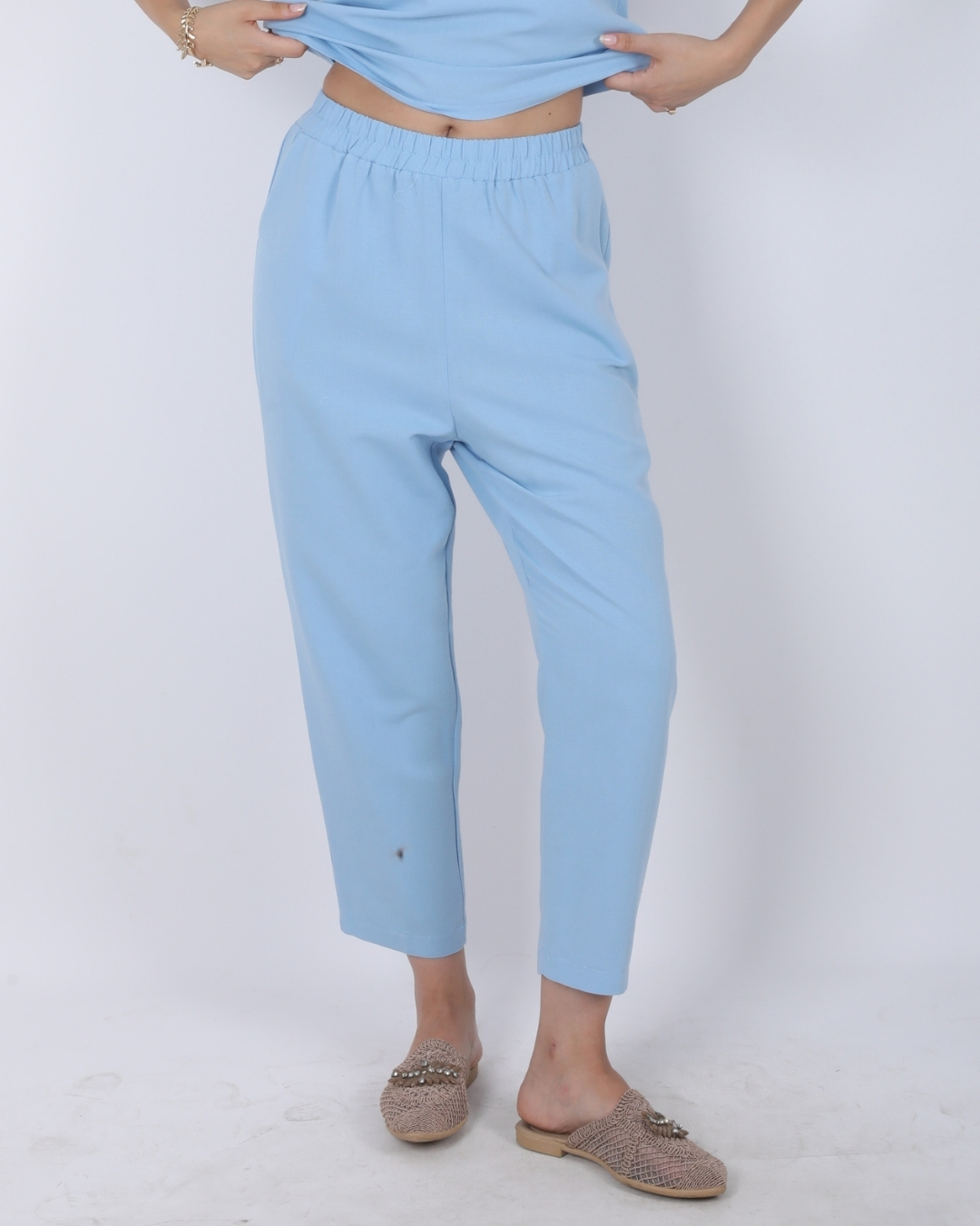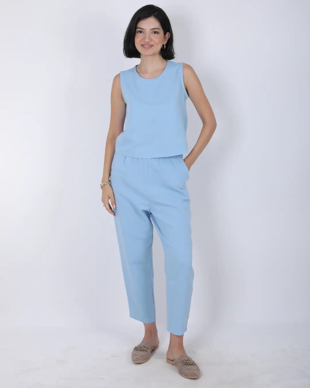 Ana Sayfa Takım Mavi Sıfır Kol Bluz Beli Lastikli Pantolon Keten Alt Üst Takım