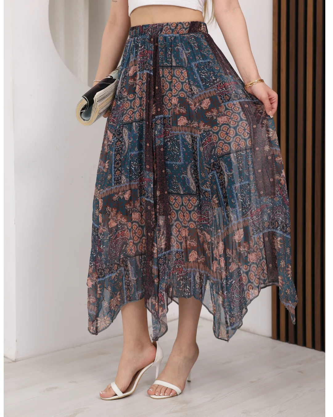 - Kadın petrol mavi etnik desenli renk geçişli şifon etek modeli, modern tasarımı ve rahat kalıbı ile günlük şıklığı tamamlayan özel bir parçadır.; Yüksek bel lastikli yapısı sayesinde vücudu sıkmadan konforlu bir kullanım sunar ve farklı beden tiplerine uyum sağlar.; Asimetrik kesimi ile hareketli ve dikkat çekici bir görünüm kazandıran bu maxi boy etek, yürüdükçe akışkan ve zarif bir duruş sergiler.; Salaş ve dökümlü yapısı sayesinde vücuda yapışmaz, gün boyu rahatlık sağlar.; 90 cm uzunluğa sahip olan bu uzun etek, hem günlük kombinlerde hem de özel günlerde tercih edilebilir.; Hafif ve nefes alabilen şifon kumaşı sayesinde özellikle bahar ve yaz aylarında ferah bir kullanım sunar.; Petrol mavi ve kahve tonlarının geçişli etnik deseni ile bohem ve modern tarzı bir arada sunar.; Tişört, gömlek, crop üst ve basic parçalarla kolayca kombinlenebilir.; Sneaker, sandalet veya topuklu ayakkabılarla farklı stiller oluşturabilirsiniz.; Günlük kullanım, tatil kombinleri, şehir şıklığı ve rahat stil arayan kadınlar için ideal bir seçimdir.
