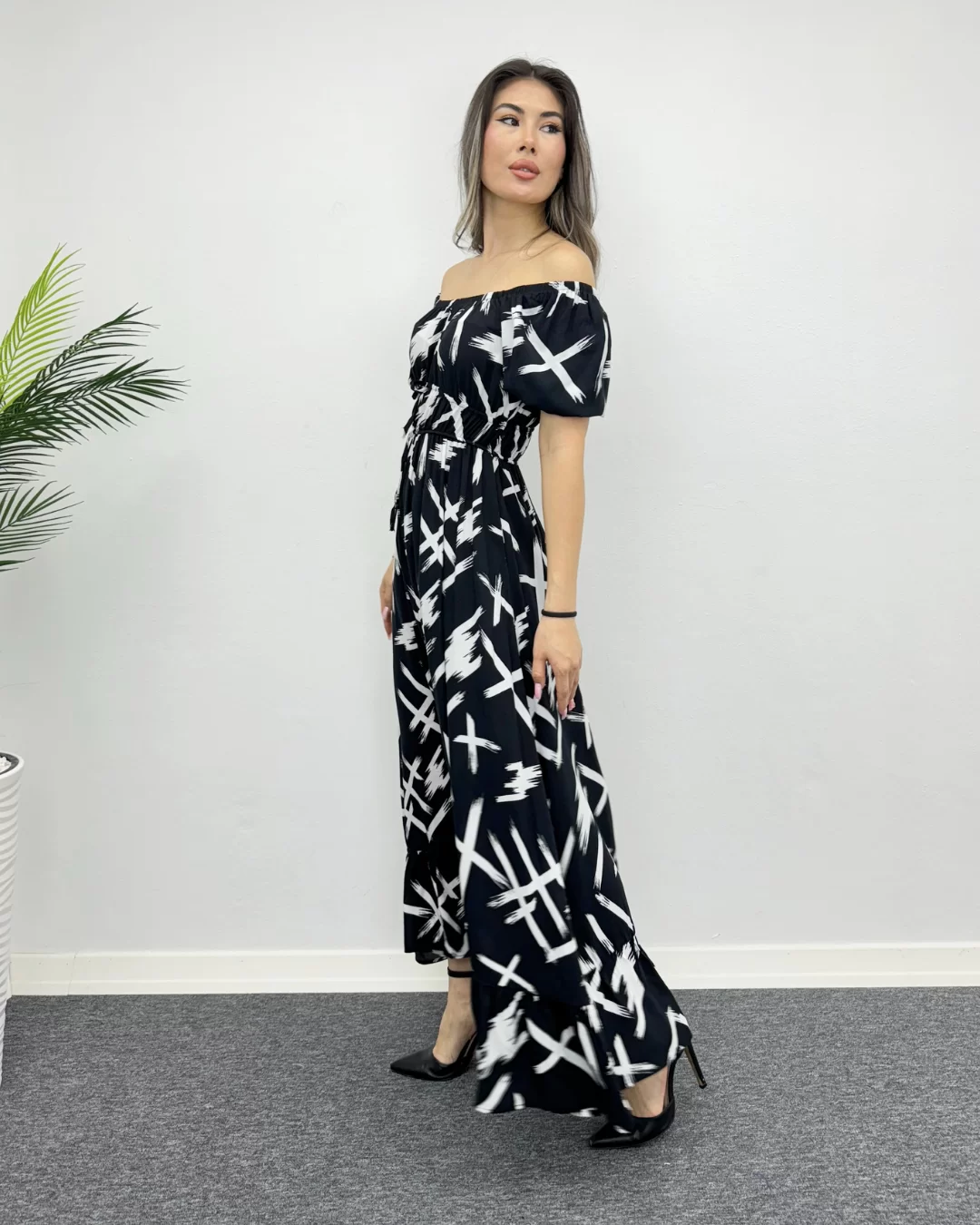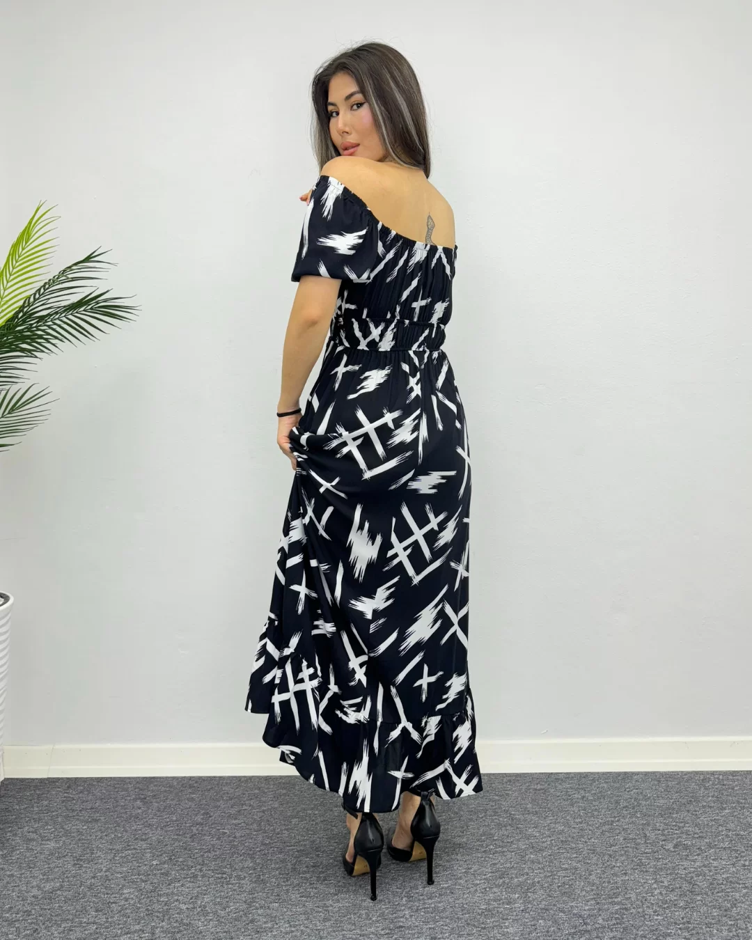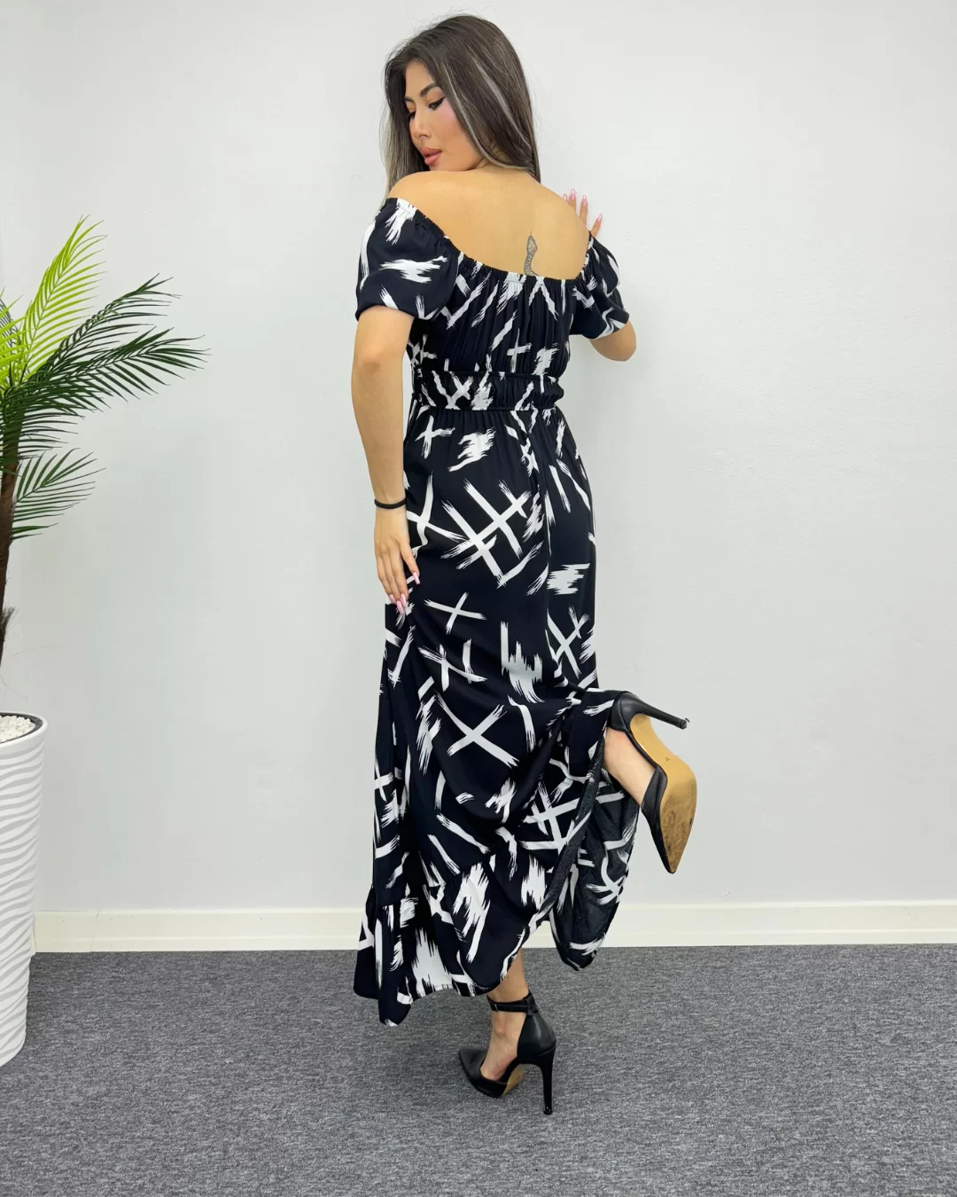Siyah Çarpım Desenli Viskon Elbise